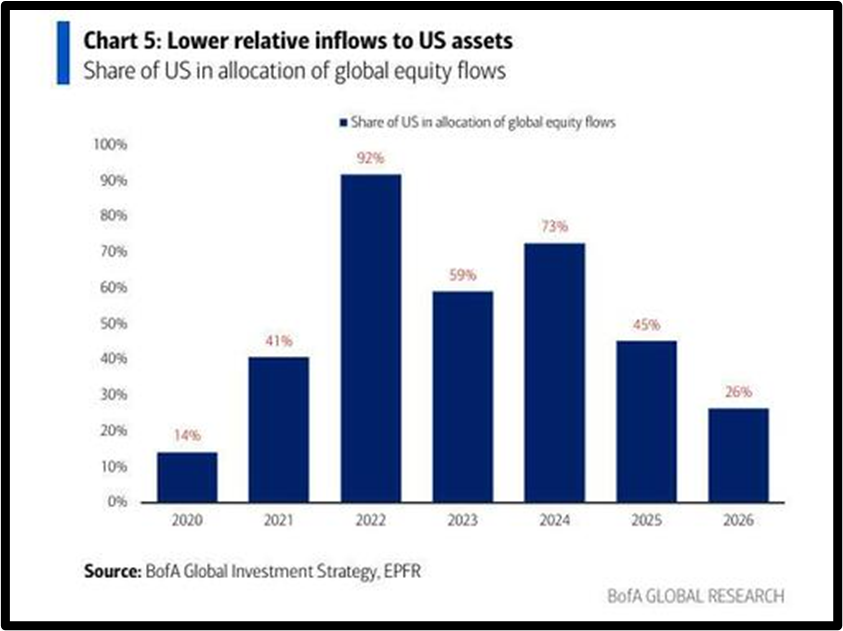 Looking at the Big Flow to Know, BofA calculated that in 2026, for every $100 of inflows to global equity funds, US stocks have accounted for $26—their lowest share since 2020.