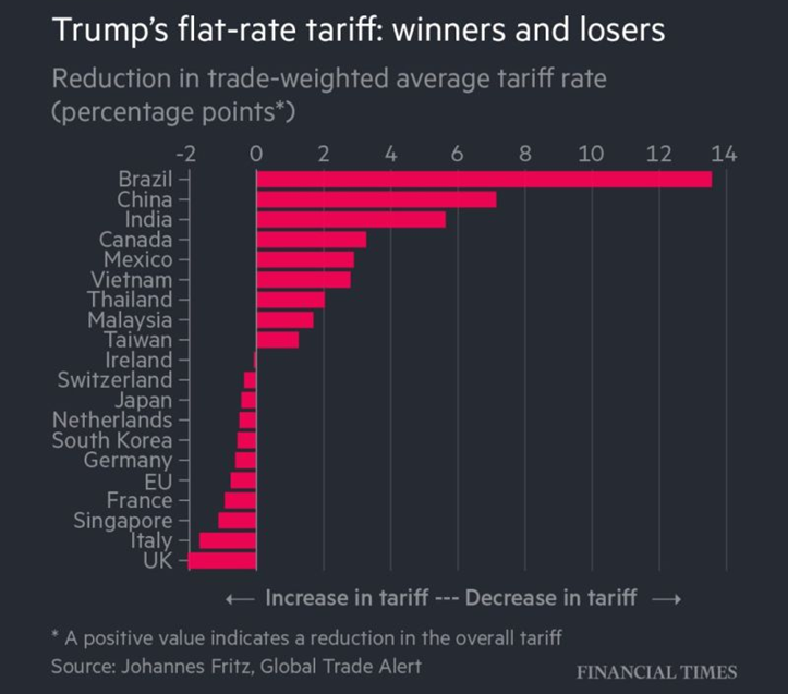Emerging countries are the beneficiaries of the new 15% tariffs. According to new analysis from Global Trade Alert, the very countries frequently singled out for criticism are set to see their average tariff rates drop the most: