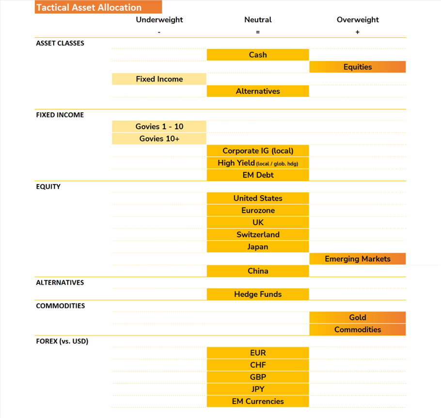 • Against this backdrop of solid economic and earnings fundamentals, a diversified and fully invested stance remains appropriate. The preferred positioning includes an overweight to equities, particularly emerging markets, selective opportunities in US mid-cap and value stocks, continued exposure to gold, commodities, and hedge funds as diversifiers, an underweight in Fixed Income, and a neutral view on the dollar.