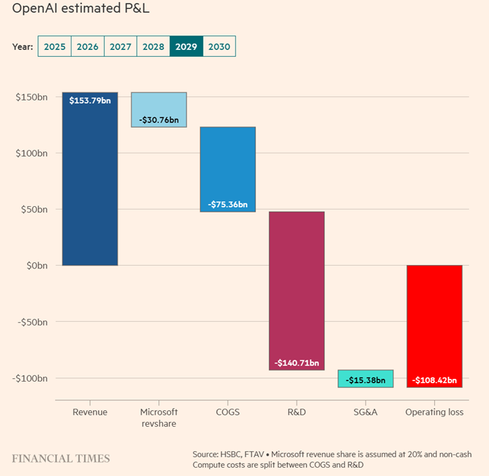 This logic has recently flipped. Over the past weeks, markets have been seeing a high-profile relationship with OpenAI as a millstone around one’s neck. SoftBank, set to own about 11% of the company, dropped nearly 40% in November. Oracle had surged after its $300 billion infrastructure deal with OpenAI. Now its credit-default-swap spreads are widening as investors rethink the risk of building huge data-centre capacity for a customer whose credit profile looks far weaker than expected. Even Microsoft, despite its size and diversification, felt the pressure. HSBC now estimates that OpenAI could accumulate close to half a trillion dollars in operating losses through 2030, a figure that raises serious questions about funding sustainability in an ecosystem already burdened by heavy capex, partner debt and stretched valuations.