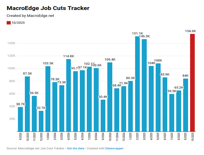 The MacroEdge Job Cuts Tracker shows a sharp rise in layoffs in October 2025, reaching around 154,600 job cuts, the highest level since early 2025. The figure is compiled from a combination of publicly announced layoff notices sourced from DailyJobCuts.com, WARN notices filed with states, TrueUp data, and Google News alerts, offering near real-time insight into corporate head-count reductions. This marks a clear acceleration from previous months, suggesting that companies are becoming more cautious amid slower consumption and still high interest rates.