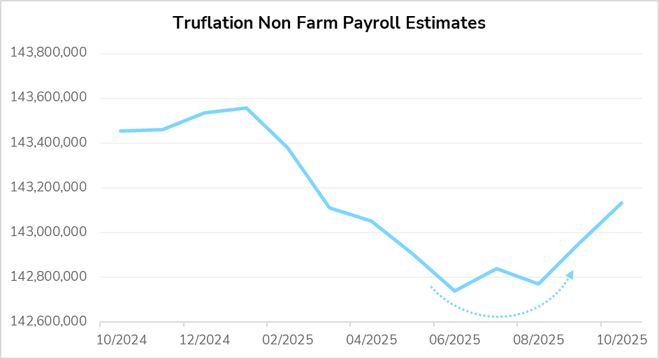 The Truflation estimate of the official Non-Farm-Payrolls tracks total employment levels and depicts a similar trajectory in the respective chart. After peaking in late 2024, total employment dipped modestly through mid-2025 before stabilising and showing signs of recovery by October. This Employment Index is built from a multi-source aggregation of public and commercial datasets, covering millions of data points and updated monthly.