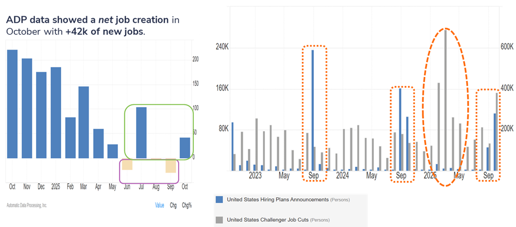 On the more traditional side of the private labour market data, the ADP job’s number was substantially above expectations with a net job creation of +42k in October. The report is based on anonymised payroll data covering more than 26 million US private-sector employees and is produced in collaboration with the Stanford Digital Economy Lab (Stanford Lab). The rebound suggests the labour market may be reaching a new equilibrium, marked by fewer job postings and a limited pool of available workers—trends partly driven by renewed immigration policies and a tighter labour supply. However, the gains were modest and confined largely to sectors like trade, transportation, and utilities, while professional services and information recorded net job losses.