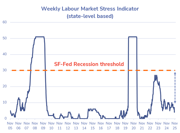 The San Francisco Fed’s US Labour Market Stress Index shows no meaningful signs of strain. The indicator has been trending downward from slightly elevated levels, remaining comfortably below the SF-Fed recession threshold. The index is derived from state-level employment, wage, and unemployment data, capturing how many US states experience significant labour-market deterioration at any given time. In other words, while the labour market has clearly cooled, it is far from entering “stress” territory.