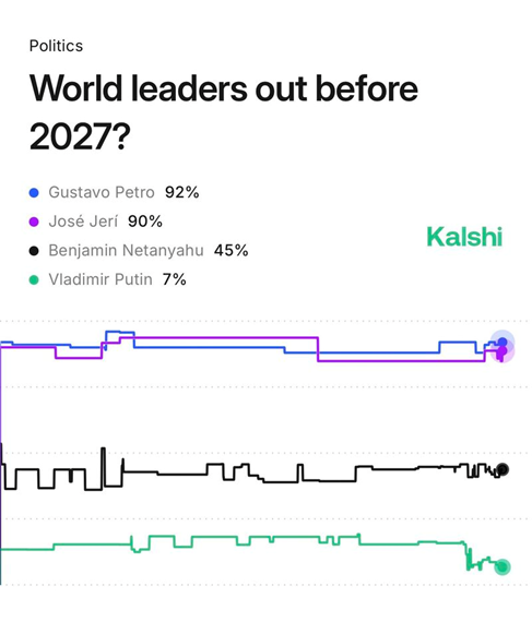 Indeed, much of South America is moving closer to Washington, leaving Brazil increasingly isolated. This matters because President Lula is a self-declared leftist who has consistently leaned toward Russia, China, and Iran. After Trump’s capture of Maduro, Kalshi odds show a 90% chance that Colombia and Peru’s presidents are "out” before 2027. In parallel, President Trump recently reiterated that Greenland should become part of the United States, underscoring a broader strategy focused on securing critical assets.