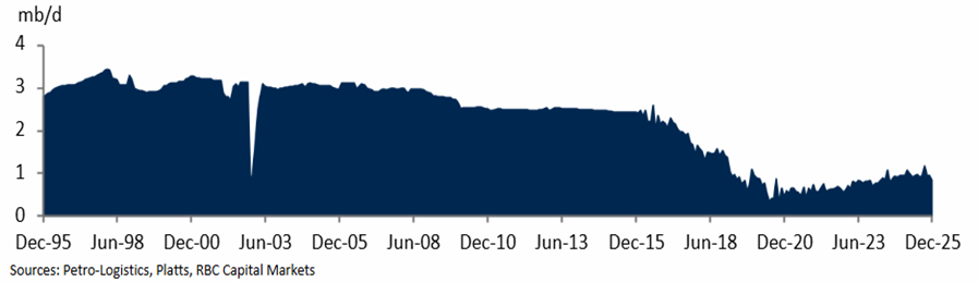 Venezuela faces even steeper constraints. Its reserves are dominated by extra-heavy crude, requiring upgrading and imported diluents for transport. Years of underinvestment, sanctions, loss of skilled labour, and the decline of state oil company PDVSA have taken a heavy toll. Aging infrastructure, repeated refinery outages, and limited access to modern drilling and upgrading technology continue to constrain any rapid recovery.
