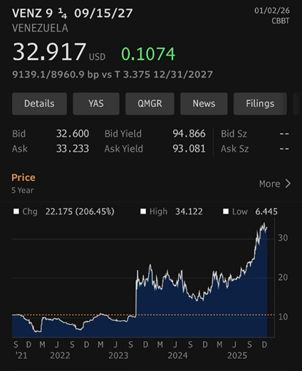 Venezuelan bonds currently trade around 25–35 cents on the dollar, reflecting sanctions risk and legal uncertainty. In a regime-change scenario, several analysts estimate recovery values in the 30–55 cent range, driven by restructuring and sanctions relief.