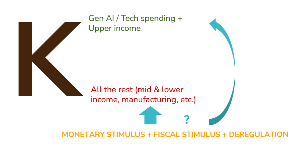 As we head towards the last quarter of the year, we remain in a K-shaped economy, especially in the US with a 2-speed economy. On one hand, the GenAI / Technology sector has a strong contribution to US economic growth while upper income consumers are still doing well. On the other hand, medium-lower income consumers, the manufacturing sectors and interest-rate sensitive sectors are all struggling. Will deregulation, fiscal & monetary stimulus help to make growth more balanced? Or will it end boosting even more the upper part of the K?