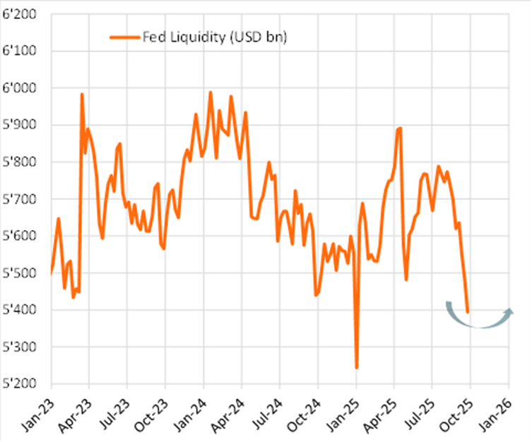 The ongoing “normalisation” of global monetary policy was again reflected in our global liquidity proxy, which continued to point to a supportive liquidity environment for risk assets. However, the “liquidity tailwind” is losing steam. The forward looking indicator started to move downwards, indicating receding additional tailwind to liquidity. Provided the relationship continues to hold, the support for risk assets will decline in the coming months, but is on average still positive. The weak US dollar was decisive for the evolution of our global M2 proxy and our current view of a stabilisation of the US dollar will limit the positive future development of our indicator. Fed liquidity is no longer a temporary headwind, as the US Treasury’s General Account at the Federal Reserve appears replenished, and the backlog in issuing Treasury bills has eased. This was necessary after the “plundering” of the “Federal checking account” since the beginning of the year. Although these conditions are expected to become less supportive than they were during summer, overall liquidity conditions continue to be favourable for risk assets .