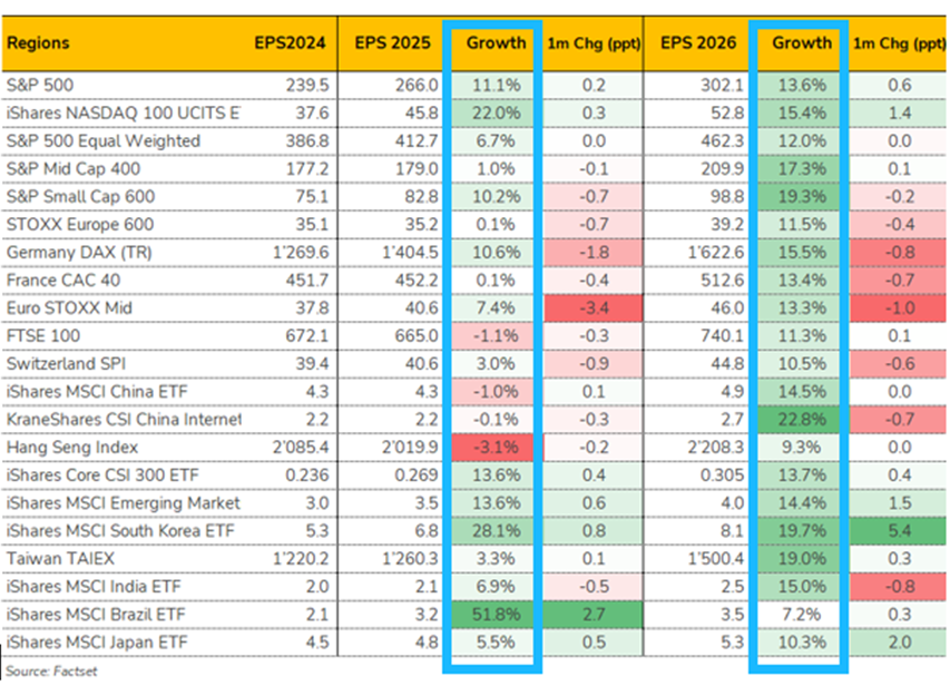 Earnings growth is expected to accelerate and to broaden in 2026 vs. 2025 thanks to continuous strength in technology and cyclical pick-up elsewhere: :
