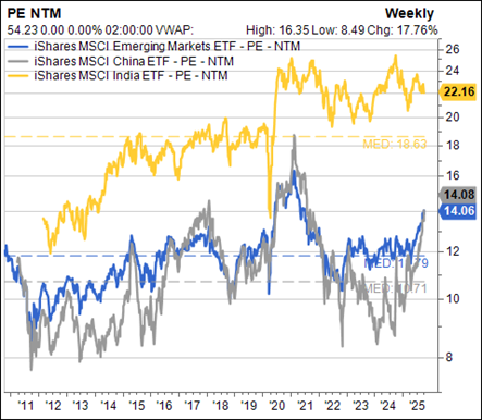 Equity valuations for large US companies remain elevated, although the growth and profitability of these mega-cap stocks are difficult to compare with historical standards. International equities are more reasonably priced relative to their history, but they do not benefit as much as the US market from the AI tailwind. Within major markets, China has re-rated from less than 9x forward P/E in 2023/24 to around 14x currently, as investors once again consider China “investable” and the AI narrative gains traction. Finally, it is worth noting that a decline in the value of money, or monetary debasement, tends to support equities as an asset class.