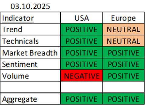 In Europe, market breadth recently turned positive, supported by upgrades in both the participation and high-low indicators. Volume also turned green. As a result, the European raw score rose significantly from 45% to 75%.