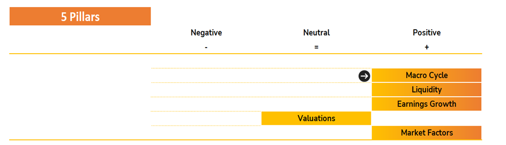 With 3 pillars (liquidity, earnings and market factors) signalling an overweight and 2 in neutral (macro, earnings and valuations), the weight of evidence is positive for equities.