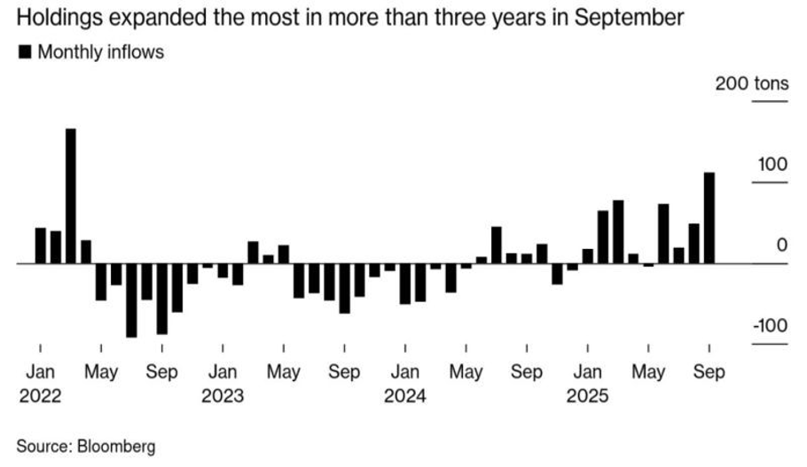 Gold trades at a new all-time high as investors seek protection from monetary debasement, a trend which is probably the most obvious we can see. Investors’ appetite for gold surged in September, with ETFs recording their largest inflows since early 2022.