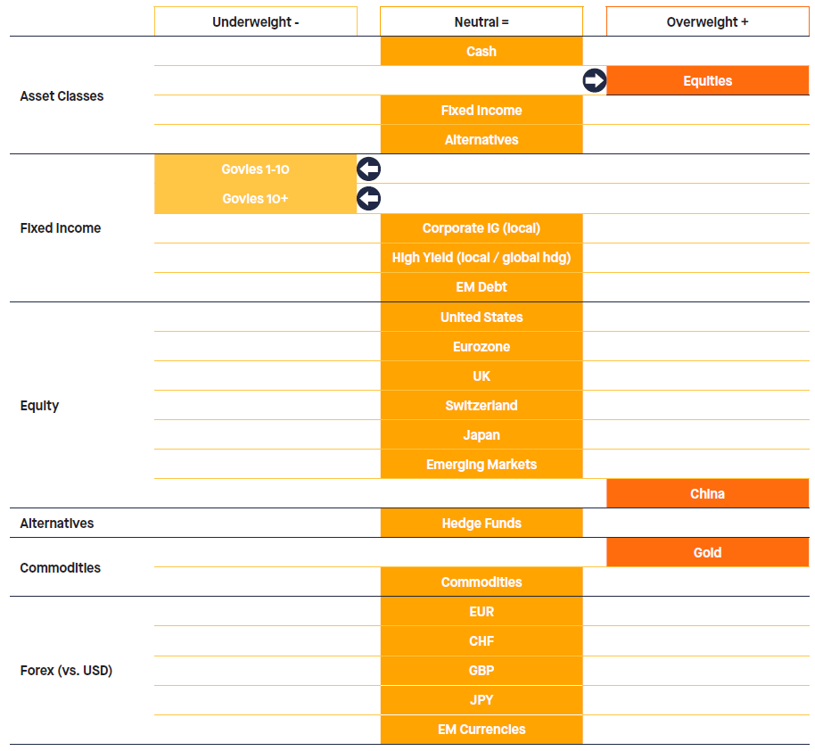 In Swiss Franc reference currency profiles, we keep Government bonds 1-10 as underweight. High Yield, EM debt and Investment Grade Corporate have been upgraded to Overweight