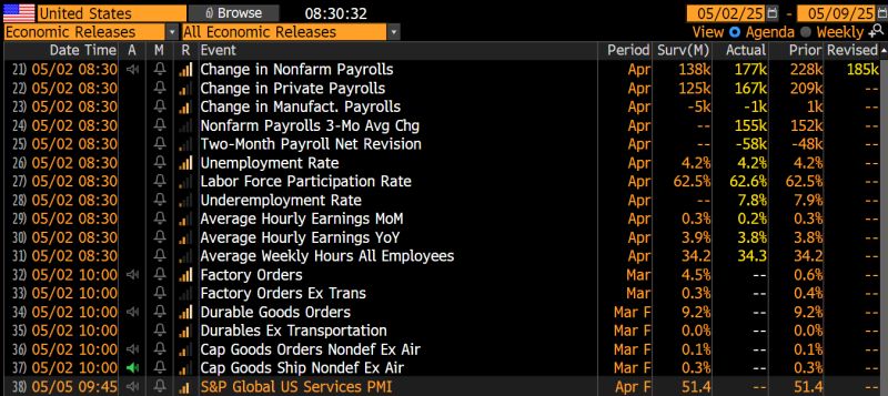 Nonfarm Payrolls, 177K Vs. 138K Est. (prev. 228K) Unemployment Rate, 4.2% Vs. 4.2% Est. (prev. 4.2%) Hourly Earnings, 3.8% Vs. 3.9% Est. (prev. 3.8%) ▶️ The US labor market has remained resilient in April. No visible impact of the tariff announcement on employment dynamics (yet?) ▶️ The US economy added 177k new jobs in April (138k expected) after 185k in March. ▶️ February and March data were revised lower (-58k overall) but remain on a decent trend, consistent with a stable unemployment rate. ▶️ As a result, the unemployment rate remains stable at 4.2% (as expected). ▶️ Wage growth slowed down slightly, to +0.2% from +0.3% (+0.3% expected). Hourly earnings are up +3.8% YoY, stable compared to the previous month. Source: Bloomberg
