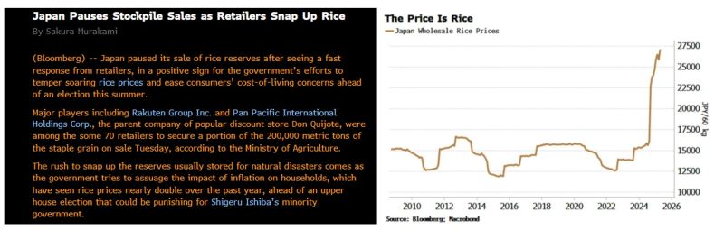 As highlighted by zerohedge, Japan does NOT actually have high CORE inflation; it does however have soaring rice prices which have skewed inflation expectations across the population as rice is a huge component of the overall CPI basket. Meanwhile the BOJ is scrambling to contain inflation - which has tumbled ex food with real wages near record lows - and is tightening conditions by raising rates even though it has zero control over food inflation. However, as a by product of its monetary policies and strong yen, the bond market is crashing every day now... This bond crash could eventually spread to Japan's banks and global markets, sparking a global crisis. They thus need to do something. Yesterday, Japan's Ministry of Finance (MOF) said they will consider tweaking the composition of its bond program for the current fiscal year, which could involve cuts to its super-long bond issuance... This was enough to trigger a big drop in bond yields and the yen, which both came as a relief for global markets. What is happening on rice (and its deflationary consequences) is anotehr positive development Source: zerohedge, Bloomberg, Macrobond