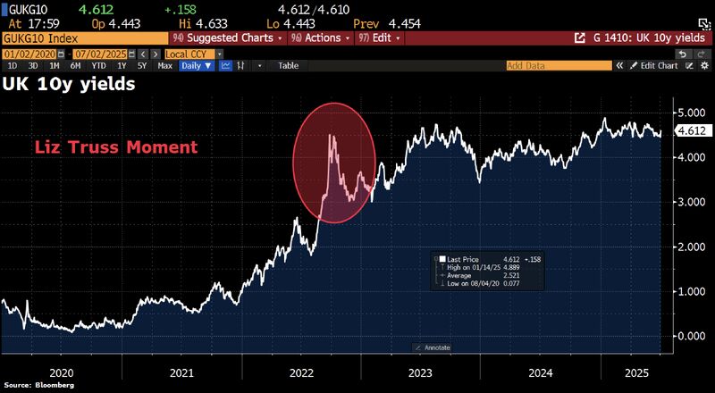 Another Liz Truss Moment in the UK? 10y Gilt yields jump 16bps on doubts over Chancellor Reeves’s future.