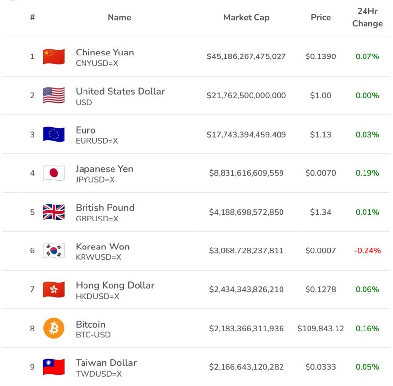 Bitcoin just surpassed Taiwan Dollar to become the 8th largest currency in the world