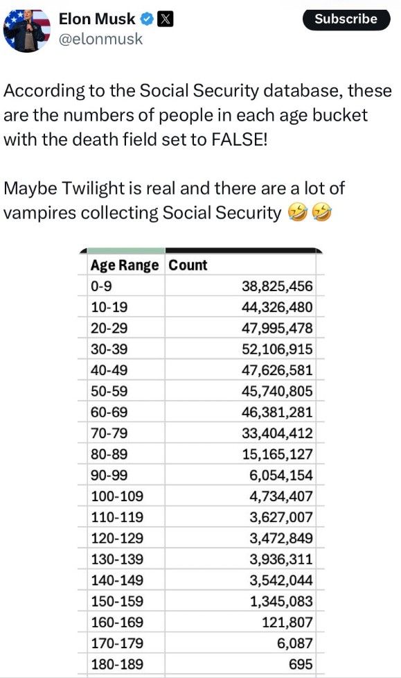 BREAKING: Elon Musk says millions of people over 140 years old are receiving Social Security benefits.