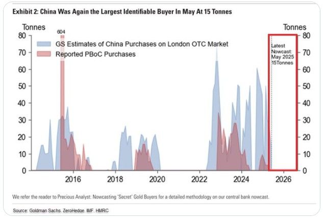 China bought 15 tonnes of gold in May, according to Goldman Sachs estimates, 8 TIMES more than officially reported figures. Over the past year, China's monthly purchases have oscillated between 25-60 tonnes. Source: Global Markets Investors, Goldman Sachs