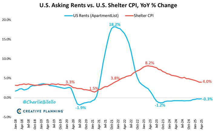Given its long lag vs. real-time rental data, a continued move lower is expected which should lead to a continued decline in core inflation. Source: Charlie Bilello @charliebilello