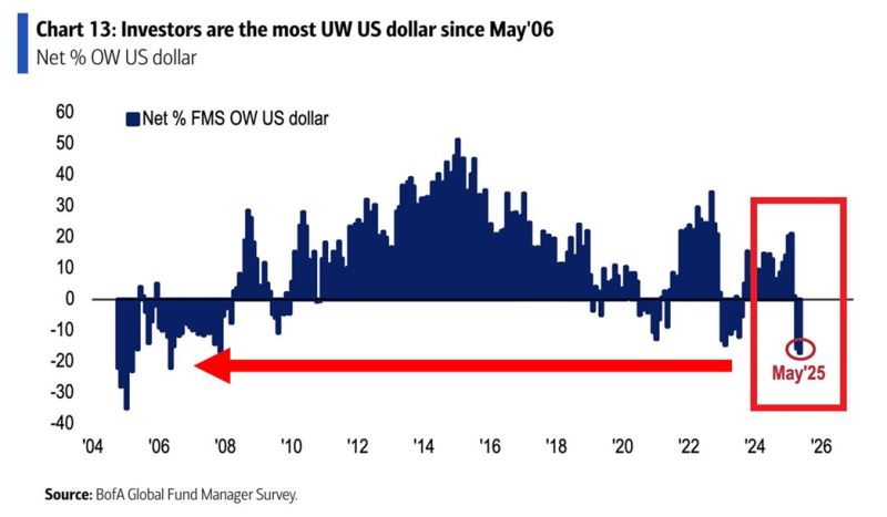 Nearly 20% of fund managers, 174 fund managers with $458 billion in assets, surveyed by BofA said they are underweight the US Dollar, the most in 19 YEARS. Is the US Dollar heading even lower?