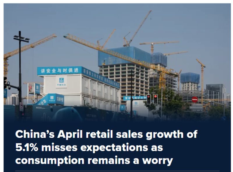 Sales had grown by 5.9% in the previous month. Industrial output grew 6.1% year on year in April, STRONGER than analysts’ expectations for a 5.5% rise, while slowing down from the 7.7% jump in March. Fixed-asset investment for the first four months this year, which includes property and infrastructure investment, expanded 4.0% from a year earlier. ➡️ As mentioned by Mo El Erian on X, the latest Chinese macro numbers illustrate a familiar pattern in the country’s economy: government measures often succeed in boosting industrial production, but tend to be less effective at stimulating household consumption Source: CNBC