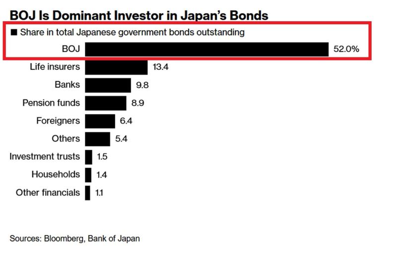 The Bank of Japan owns a whopping 52% of its domestic government bond market. Since July, the BoJ has been gradually reducing the size of its holdings. The estimated value of Japan's government debt market is $7.8 TRILLION, world's 3rd largest. Source: Global Markets Investor, Bloomberg