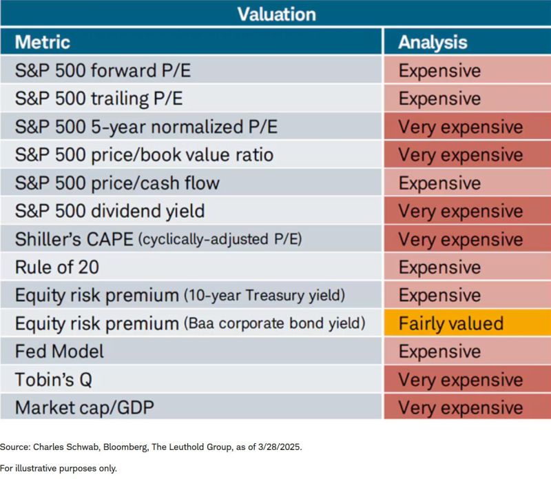 As shown below, the US stock market is expensive or very expensive on 12 out of 13 valuation indicators, according to Charles Schwab analysis. Metrics like 5-year normalized P/E, P/B or Shiller's CAPE are still historically elevated despite the sell-off. Source: Charles Schwab, The Leuthold Group, Bloomberg thru Global Markets Investor