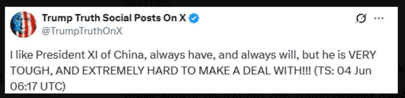 At a time when the White House has been suggesting the two leaders could talk this week amid a rise in trade tensions: “I like President XI of China, always have, and always will, but he is VERY TOUGH, AND EXTREMELY HARD TO MAKE A DEAL WITH!!!,” the U.S. president wrote on Truth Social. That post on the social media platform came after a senior White House official told CNBC on Monday that Trump and Xi were likely to speak this week. Chinese Foreign Minister Wang Yi told the new U.S. Ambassador David Perdue during a meeting Tuesday that the recent string of “negative measures” by the Trump administration were based on “groundless reasons,” and undermined China’s legitimate rights and interests, according to the official English readout. Source: CNBC