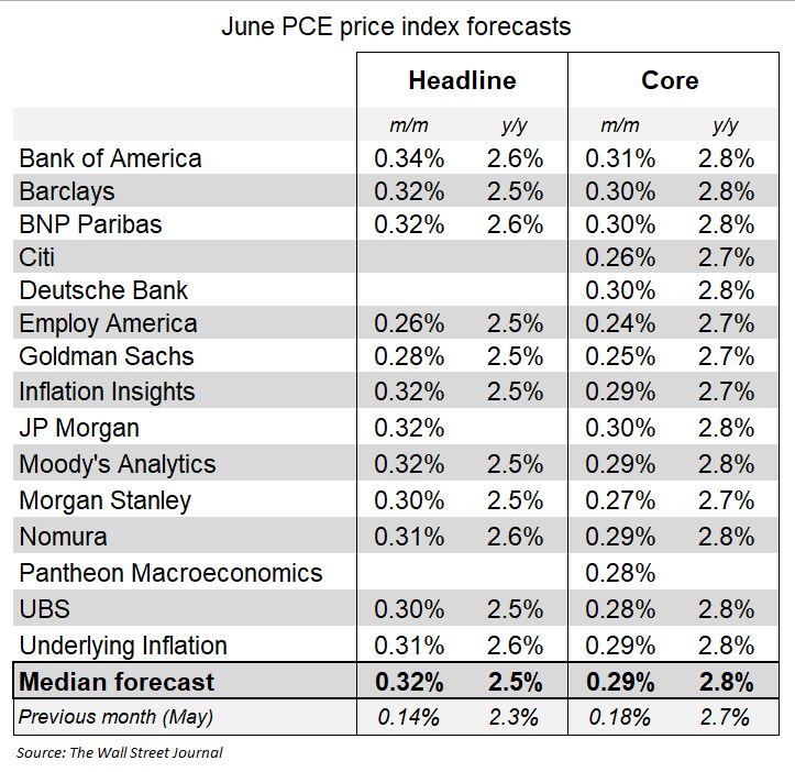 Economists who translate the CPI and PPI into the PCE expect monthly core inflation firmed in June. BEA reports this on Thursday.