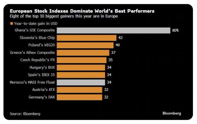 8 of the world's 10 best-performing stock markets are in Europe this year, w/Germany's Dax rallying >30% in Dollar terms: Peripheral markets such as Slovenia, Poland, Greece, and Hungary also performing well. Source: HolgerZ, Bloomberg