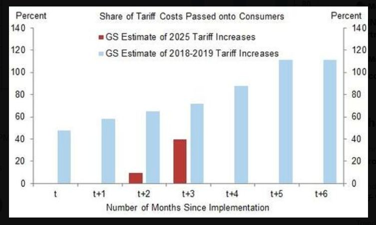 Goldman Sachs analysis suggests that the share of tariff costs that fell on consumers rose from 0% in the first month of implementation to 10% after two months.