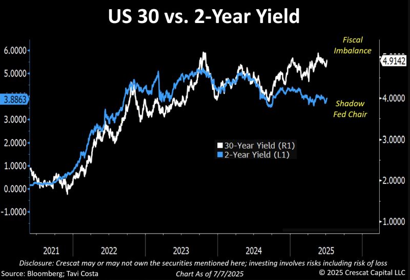 ▶️ Front end of the curve (short-term rates): the growing influence of the "shadow Fed chair" on short-term rates ▶️ Long end of the curve (30Y): The mounting fiscal disarray It seems that risk assets and store of values are the main beneficiaries of this backdrop. Source: Bloomberg, Tavi Costa