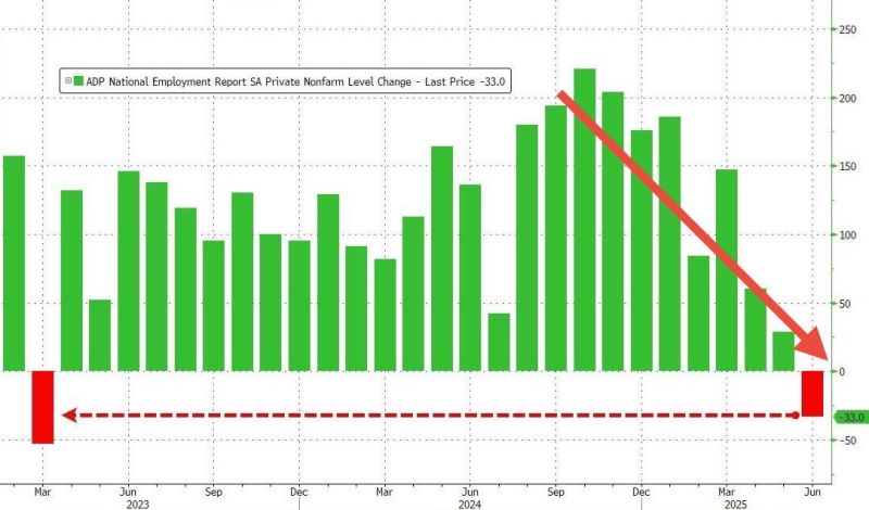 *ADP PRIVATE PAYROLLS: -33K vs 98K exp. First negative print since March 2023. Private sector hiring unexpectedly contracted in June, payrolls processing firm ADP said Wednesday, in a possible sign that the economy may not be as sturdy as investors believe as they bid the S&P 500 back up to record territory to end the month. Private payrolls lost 33,000 jobs in June, the ADP report showed, the first decrease since March 2023. Economists polled by Dow Jones forecast an increase of 100,000 for the month. The May job growth figure was revised even lower to just 29,000 jobs added from 37,000. To be sure, the ADP report has a spotty track record on predicting the subsequent government jobs report, which investors tend to weigh more heavily. May’s soft ADP data ended up differing significantly from the monthly jobs report figures that came later in the week. Source: Zerohedge, Bloomberg, CNBC