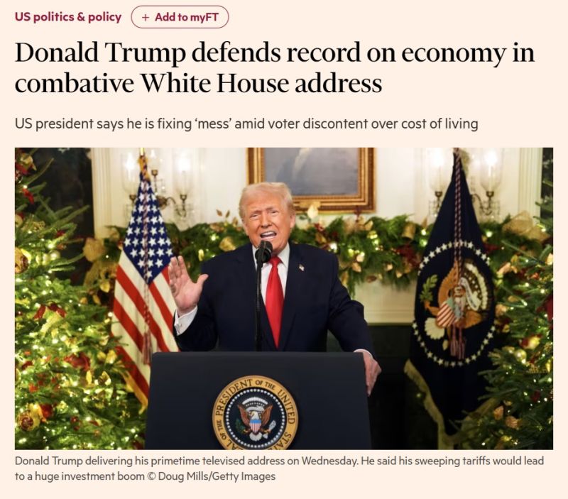 Last night, President Trump took to the airwaves for a primetime address that has everyone talking. Whether you agree with the strategy or not, there are some massive leadership lessons—and market-shifting announcements—we can’t ignore. Here is the breakdown of the "Second Term Revitalization" speech: 🚀 The Big Economic Bet: Trump is doubling down on tariffs as the engine for a "boom the likes of which the world has never seen." Despite a 3% CPI, the administration is betting on a radical shift in domestic investment. 📉 The Interest Rate Pivot: A new Federal Reserve Chair is coming. The criteria? Someone who believes in lowering rates "by a lot." This is a clear signal to the markets: the administration wants borrowing costs and mortgage payments down, now. 🎖️ The "Warrior Dividend": In a move to honor the upcoming 250th anniversary of the USA, Trump announced a $1,776 bonus for military members. A strategic play to shore up support within the ranks. 💊 Healthcare & Disruptive Innovation: Rejecting the extension of current subsidies, the plan is now direct-to-consumer. "I want the money to go directly to the people." It’s a bold move toward a market-driven healthcare model. The Reality Check: The address comes at a high-stakes moment. With a 54% disapproval rating and internal White House friction making headlines, the "rushed and combative" tone of the speech shows a leader under immense pressure to deliver results—fast. Leadership isn’t just about the vision; it’s about the execution. The world is watching to see if these "Grand Slams" translate into relief for the American household. Source: FT