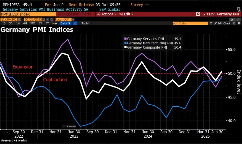 The composite PMI rose to 50.4, up from 48.5 in May, signaling a move back into expansion territory. Manufacturing – a key sector for Germany – saw its PMI climb to 49, the highest level since 2022. While still below the long-term avg of 51.6, it's a notable improvement. The sector appears to be benefiting strongly from falling interest rates, which may help explain why Germany is currently outperforming much of the rest of the Eurozone. Source: HolgerZ, Bloomberg