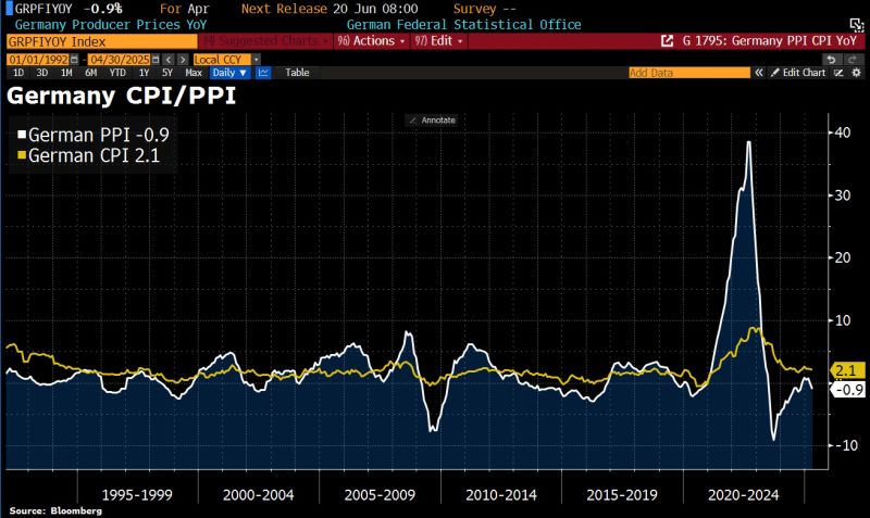 Producer Price Index (PPI) dropped by 0.9% YoY, driven mainly by a strong Euro and possibly early impact of US tariffs. PPI is an important leading indicator for consumer inflation, so this drop could signal further cooling in prices. Source: Bloomberg, HolgerZ