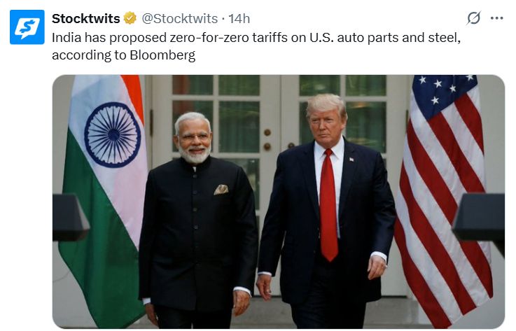 India has proposed zero-for-zero tariffs on U.S. auto parts and steel, according to Bloomberg