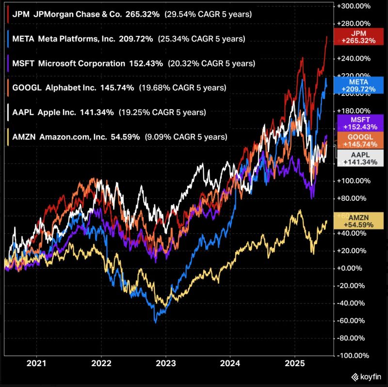 $JPM JPMorgan has outperformed 5 of the Magnificent 7 over the last 5 years.