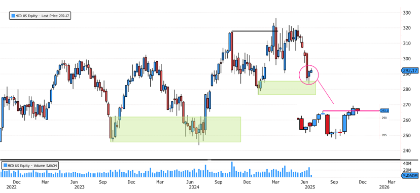 McDonald's (MCD) has consolidated 13% since the highs and is now back on the major swing support zone between 276-286. Yesterday, we saw some positive price action on the 4-hour chart, indicating a potential short-term trend change. Keep an eye on the price action over the next few days for further developments. Source: Bloomberg