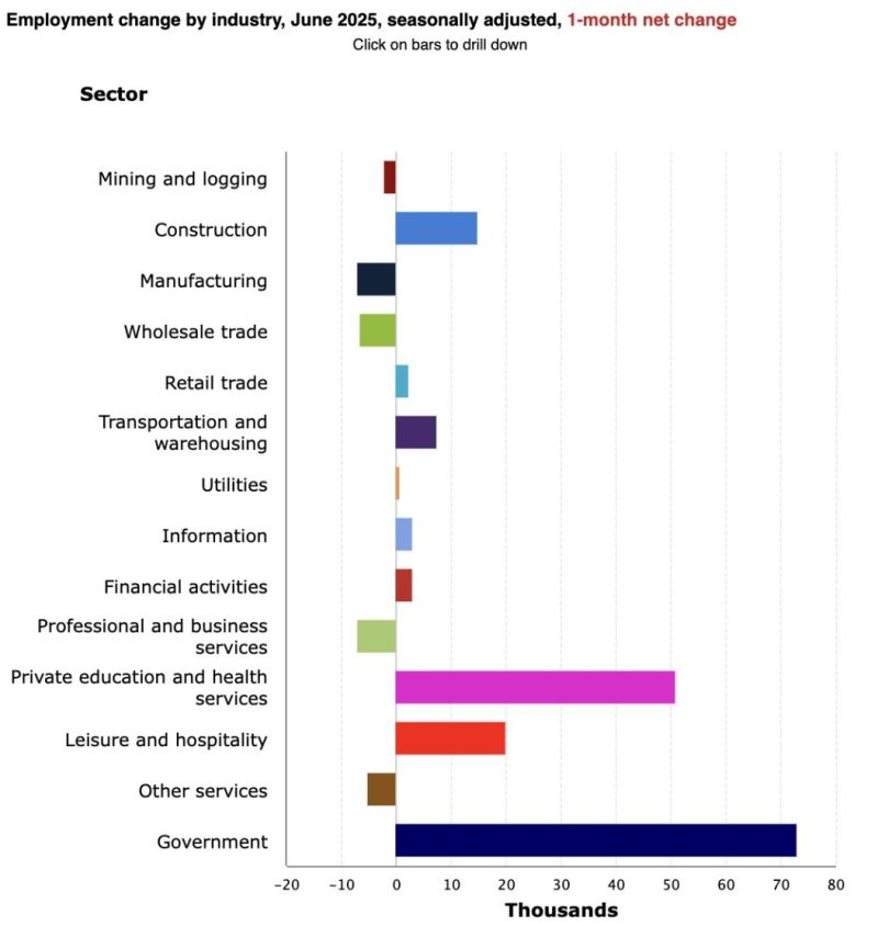-> The 147,000 job gains in June were almost all (over 75%) in healthcare and government. Government: +73,000 Healthcare: +39,000 The government job gains looked like this: State gov't education +40,000 State gov't non-education +7,000 Local gov't education +23,000 Local gov't non education +10,000 Federal gov't -7,000 Source: Heather Long on X