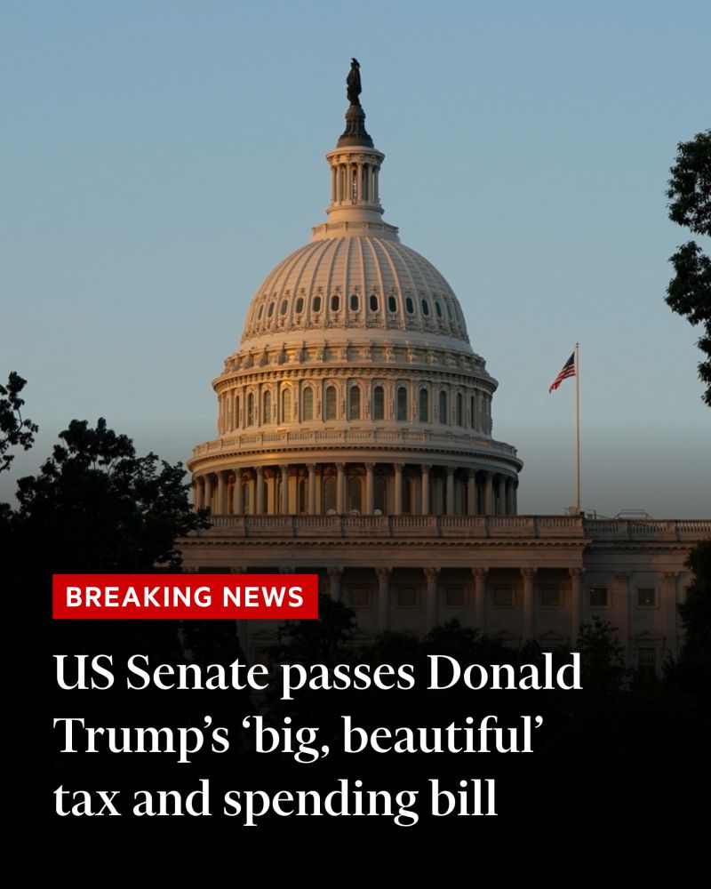 Donald Trump’s landmark tax and spending legislation moved a step closer to becoming law on Tuesday after the US Senate ended days of haggling and narrowly passed the so-called big, beautiful bill. The bill’s passage through Congress’s upper chamber now leaves its fate in the hands of the House of Representatives, where it could still face considerable opposition ahead of a looming July 4 deadline. The Senate approved the sweeping legislation, 51-50, after vice-president JD Vance cast the tiebreaking vote. The president celebrated the legislation’s progress and turned up the pressure on the House to approve it by the end of the week. He urged Republicans in the lower chamber to ignore “GRANDSTANDERS” and do “the right thing, which is sending this Bill to my desk” to be signed into law. Source: FT