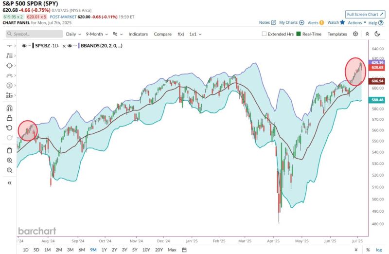 The SP500 has traded above its upper Bollinger Band for the past 8 days.