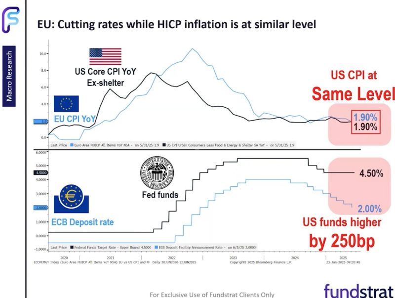 The EU inflation rate excludes shelter, do the same with US CPI, and they match. Yet Fed Funds is 250bps higher than the ECB rate. What Trump does not take into account is that the inflationary effects of tariffs might soon hit. Source: Mike Zaccardi, CFA, CMT, MBA, Fundstrat
