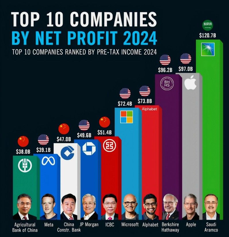 1. Saudi Aramco: $120.7B 2. Apple: $97.0B 3. Berkshire Hathaway: $96.2B 4. Alphabet (Google): $73.8B 5. Microsoft: $72.4B 6. ICBC: $51.4B 7. JP Morgan Chase: $49.6B 8. China Construction Bank: $47.0B 9. Meta (Facebook): $39.1B 10. Agricultural Bank of China: $38.0B Source: Statista