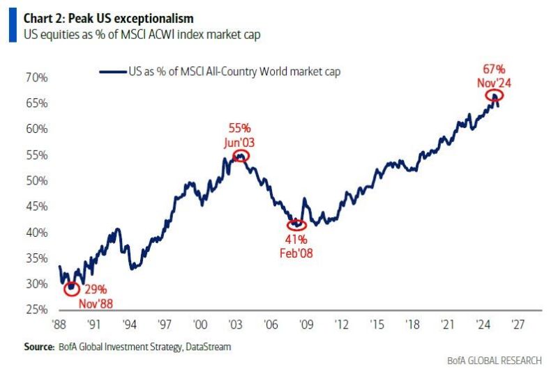 The US share in the global stock market has fallen 3-4 percentage points since its November 2024 peak of 67%. This comes as the US has significantly underperformed other markets this year. Many investors are not ready for this.. Source: BofA, Global Markets Investor