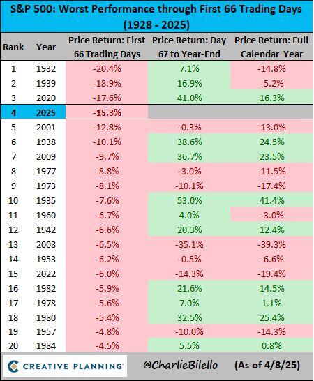 The S&P 500 is down 15.3% in the first 66 trading days of 2025, the 4th worst start to a year in history.