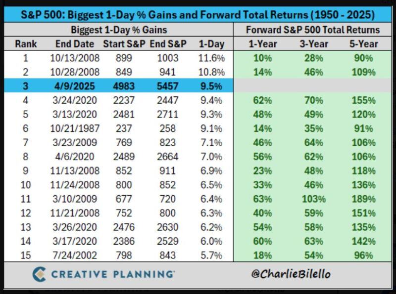 What has happened in the past following the biggest 1-day gains? Stocks moved substantially higher over the next 1, 3, 5 years every time. Source: Charlie Bilello